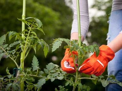 Determinate (bush) shaped tomato plants will grow to a specific size with branches of tomatoes. There is no need to prune them. If you see any leaves turning yellow or laying too close to the soil, you can remove them so that soil-borne diseases don’t reach the fruit. Indeterminate (climbing) tomatoes will continue to grow during their life cycle. Remove the side stems (suckers) from between the main stem and fruiting branches, as this will help redirect the natural growth hormones within the plant to the fruit. It also stops awkward branches from forming, which can make the plant become too heavy. Tomatoes enjoy having airflow between their stems and branches as this gives the fruit a chance to receive sunlight while growing.